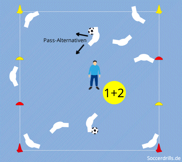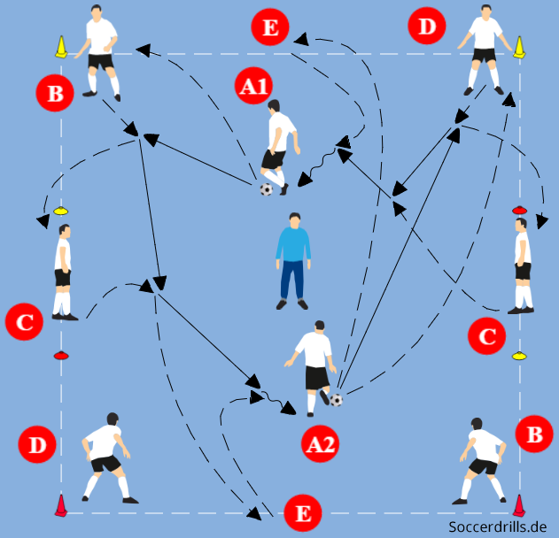 - Ablauf wie 1 oder 2. Der Trainer gibt ein Kommando, entweder „Rot“ oder „Gelb“. Entsprechend erfolgt der Pass von A1 und A2 zum Mitspieler an der aufgerufenen Hütchenfarbe.