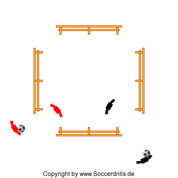 Die ersten Spieler jedes Teams starten ein Dribbling gegen den Uhrzeigersinn. Nachdem sie zwei Bänke mit Doppelpass passiert haben, starten die Spieler durch eine Lücke diagonal in Richtung Startposition. Kurz nach dem Abbiegen auf die Diagonale erfolgt ein genauer Pass ins die Startteam. Der Spieler schließt sich seiner Mannschaft wieder an.