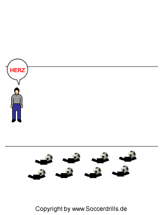 Auf Kommando des Trainers starten die Kinder dribbelnd über eine Linie auf die andere Hallenseite. Soweit nichts ungewöhnliches, nur der Trainer startet die Übung mit dem Ausruf einer Figur, in unserer Animation mit "Herz".