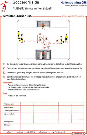 Diese Übung eignet sich besonders für die Halle, weil oft die Stangen auf der Mittellinie aufgestellt werden können. Die Pässe können dann als vertikale Pässe weit vors Tor gespielt werden. In kleineren Hallen werden die Pässe dann zu Kurzpässen, was nicht einfacher ist.
