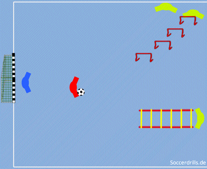 Material: Eine Koordinationsleiter, 4 Minihürden, ein Tor und ausreichend Bälle.