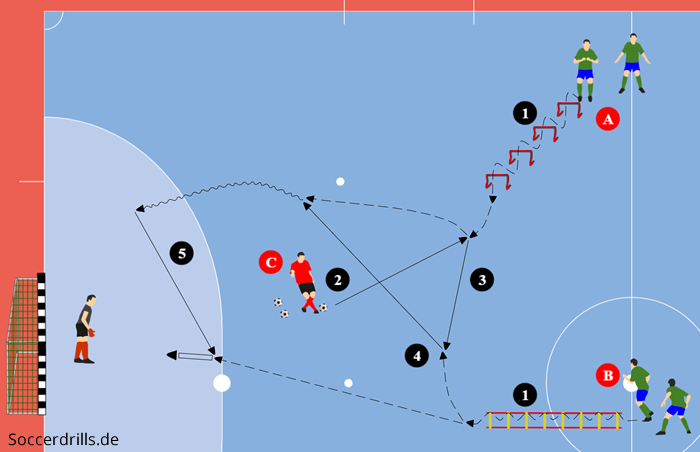 - Die Pass- und Laufwege werden nicht vorgegeben, die Spieler agieren frei. Der erste Pass kann auch auf den Spieler erfolgen, der aus der Koordinationsleiter kommt.