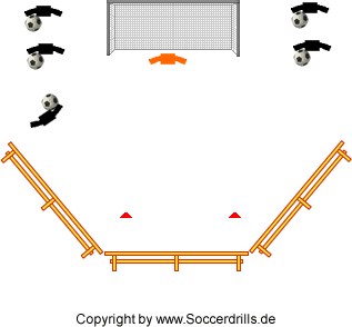 Auf beiden Seiten des Tores befindet sich jeweils ein Team mit Bällen. Mit 3 Bänken wird ein Käfig aufgebaut, der auf einer Seite vom Tor begrenzt wird. Auf der linken und rechten Seite der Kopfbank befinden sich zwei Bodenmarkierungen. Der Abstand der Markierungen zur Bank beträgt 1 bis 2 Meter.