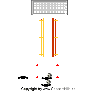Der Ball wird, nach kurzem Dribbling, durch den Trichter ins Tor geschossen. Für jeden Torerfolg, ohne Berührung des Trichters, erhält der Torschütze 2 Punkte. Bei Torerfolg mit vorheriger Trichterberührung gibt es 1 Punkt. Wer hat nach 10 Versuchen die höchste Punktzahl?