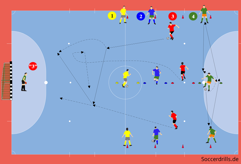 Wie sich die Futsal-Übung an kleine Hallen anpassen lässt, kannst du weiter unten nachlesen. Wir haben uns in der Darstellung für eine große Halle entschieden und deshalb gleich 4 Passgruppen am Start. Einfacher im Ablauf ist eine Reduzierung auf 3 Passgruppen, es steht dann mehr Raum zur Verfügung.