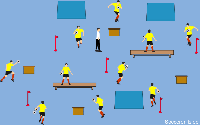 - Wir nutzen im Beispiel 2 Bänke, 4 Kästen, 3 Matten und 5 Fahnen (Stangen).