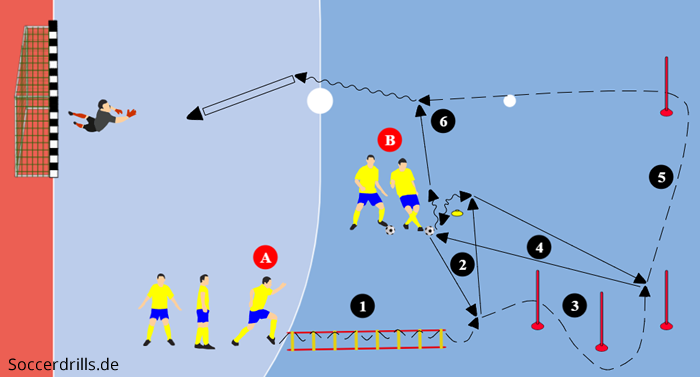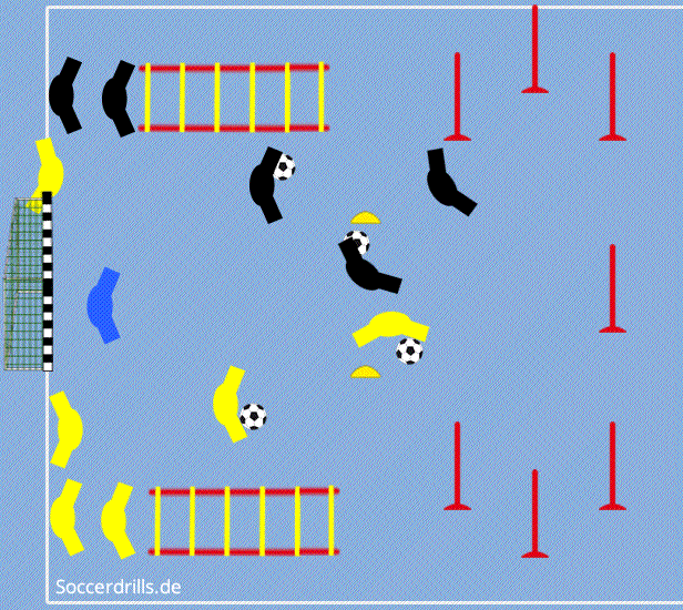Material: Ausführung von einer Seite: Eine Koordinationsleiter, 4 Stangen, eine Bodenmarkierung, ein Tor und Bälle.