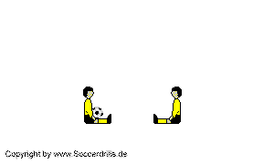 Der Ball wird mit beiden Händen leicht zugeworfen. Vom Partner wird der Ball dann genau in die Arme zurückgeköpft. Den Abstand zwischen den Spielern erst gering halten und nach einiger Übung vergrößern. Der Druck beim Kopfball kommt aus dem Oberkörper, nicht vom Kopf. Durch das Sitzen wird diese Technik unterstützt.