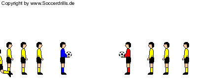Teile die Spieler in zwei Gruppen, die sich frontal gegenüberstehen. Vor jeder Reihe wird ein Zuwerfer postiert. Diese beiden Spieler werfen den Ball von unten zu und blockieren gleichzeitig den Kopfballspieler bei der Ausführung. Nach dem Kopfball laufen die Spieler ans Ende ihrer Reihe oder wechseln in die gegenüberliegende Gruppe.