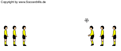 Zwei Spielerreihen stehen sich frontal gegenüber. Jeweils der erste Spieler jeder Reihe köpft den Ball auf die andere Seite. Nach dem Kopfball laufen die Spieler ans Ende ihrer Reihe oder wechseln in die gegenüberliegende Gruppe.