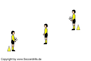 Zwei Spieler mit Ball stehen, wie in der Animation zu sehen, seitlich versetzt zum Übenden in der Mitte. Der Ball wird abwechselnd zum Sprungkopfball zugeworfen. Das Zuspiel soll sehr genau und nicht zu hart erfolgen. Der köpfende Spieler versucht den Ball am höchsten Punkt zu treffen. Achte auf technisch einwandfreie Durchführung. Nach einigen Versuchen wird der Mittelspieler ausgetauscht.