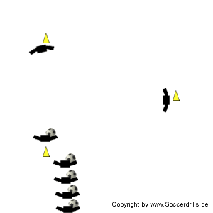 Eine Gruppe mit Bällen, wie in der Animation zu sehen. Auf den anderen beiden Positionen im Dreieck befindet sich jeweils ein Spieler ohne Ball. Der Startspieler passt auf die gegenüberliegende Position zum Mitspieler, der den Ball sofort auf die dritte Anspielstation im Dreieck weiterleitet. Zwischenzeitlich folgt der Startspieler seinem Passspiel und umläuft den angespielten Mitspieler. Nach dem Umlaufen erhält er einen genauen Pass in den Lauf vom Spieler auf der dritten Position. Er kontrolliert den Ball und schließt sich der Startgruppe wieder an. Statt Ballkontrolle kann auch ein Torschuss erfolgen, dazu müsste dann noch ein Tor aufgebaut werden.