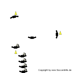 Eine Gruppe mit Bällen, wie in der Animation zu sehen. Auf der zweiten und dritten Positionen im Dreieck und im Übungszentrum befindet sich jeweils ein Spieler ohne Ball. Der Startspieler passt auf die gegenüberliegende Position zum Mitspieler, der den Ball sofort auf die dritte Anspielstation an der Markierung weiterleitet. Von dort erfolgt das Passspiel zum Zentrumsspieler. Zwischenzeitlich folgt der Startspieler seinem Passspiel und umläuft den angespielten Mitspieler. Nach dem Umlaufen erhält er einen genauen Pass in den Lauf vom Spieler aus der Mitte. Er kontrolliert den Ball und schließt sich der Startgruppe wieder an. Statt Ballkontrolle kann auch ein Torschuss erfolgen, dazu müsste dann noch ein Tor aufgebaut werden.
