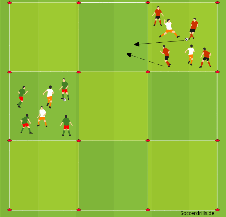 - Hat jeder Überzahlspieler den Ball einmal gepasst, startet das Team mit Passspiel in ein anderes Quadrat auf dem Feld, die Verteidiger ziehen mit. Dort beginnt der Ablauf erneut.