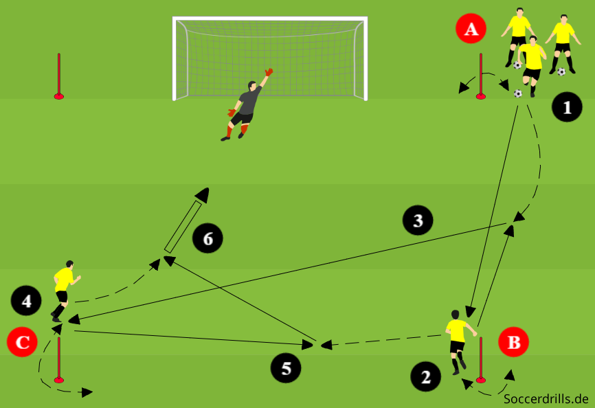 Bei Übungsstart kannst du den Torschuss auch weglassen. Der letzte Pass wird dann genau in den Lauf von C gespielt und dieser dribbelt ums Tor herum zur Startposition.