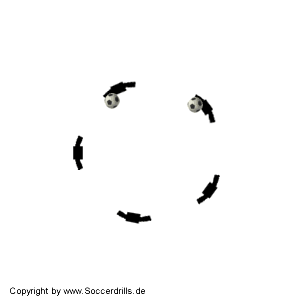 Mindestens 5 Spieler bilden einen Kreis und passen sich 2 Bälle zu. Es gibt keine bestimmte Passreihenfolge. Der gesamte Kreis bewegt sich in verschiedene Richtungen.