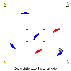 Ein Spieler befindet sich in einem Rechteck im Zentrum eines abgesteckten Übungsfeldes. Die Aufgabe des Spielers im Zentrum ist es, den Ball immer wieder in die ballbesitzende Mannschaft zu verteilen. Er wird ständig angespielt. Die Verteidiger dürfen das Rechteck des Centerspielers nicht betreten.