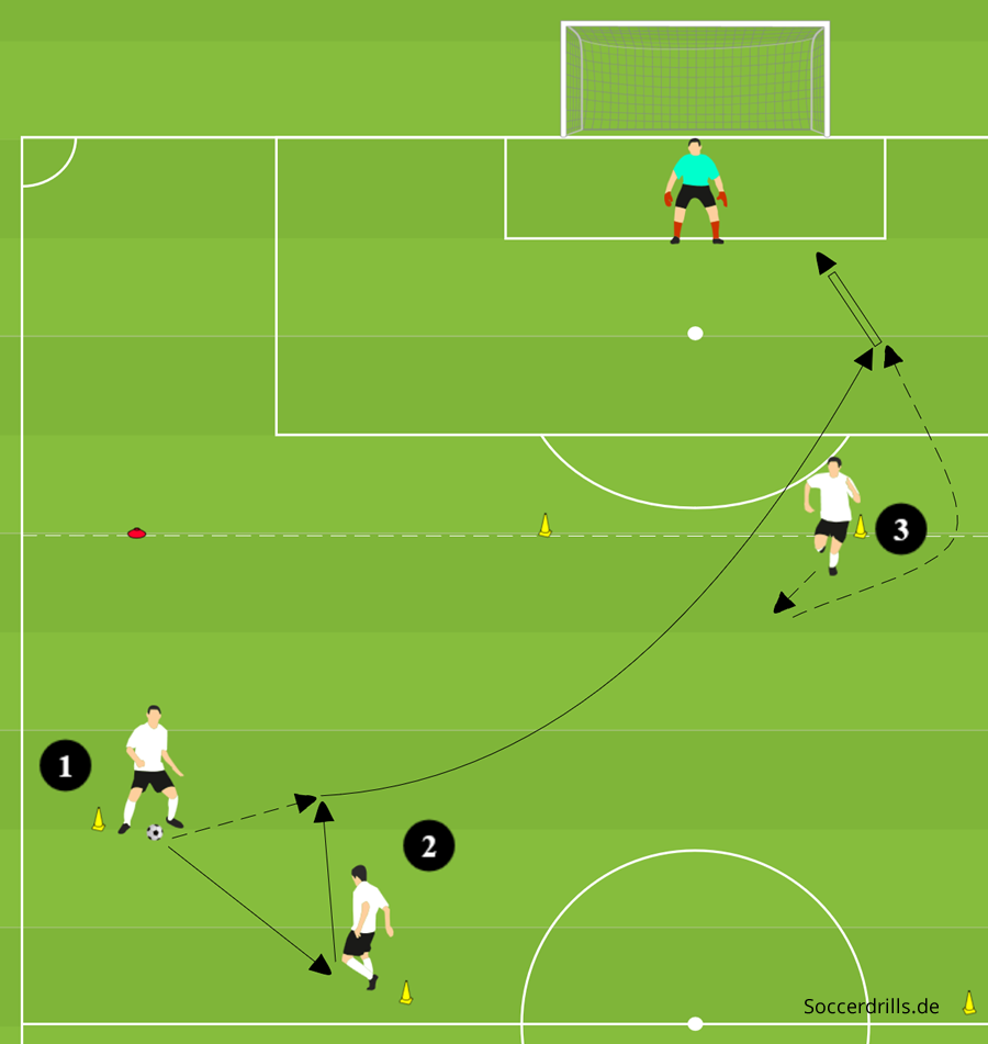 Eine besondere Bedeutung kommt dem Spieler auf Position 3 zu. Er muss sich rechtzeitig vom Gegenspieler (Hütchen) lösen und anbieten. Anschließend zieht er dynamisch nach hinten zum Tor. Dies soll mit hohem Tempo erfolgen und trotzdem muss das Timing stimmen, damit er sich bei der Ballabgabe nicht im Abseits befindet. Zur Orientierung kennzeichnen wir eine Abseitslinie. Idealerweise befindet sich der Trainer auf Höhe dieser Linie und entscheidet über Abseits.