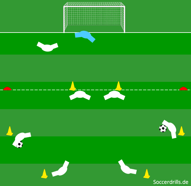 - Wir nutzen für den Ablauf von beiden Übungsseiten 6 Hütchen und zwei Bodenmarkierungen.