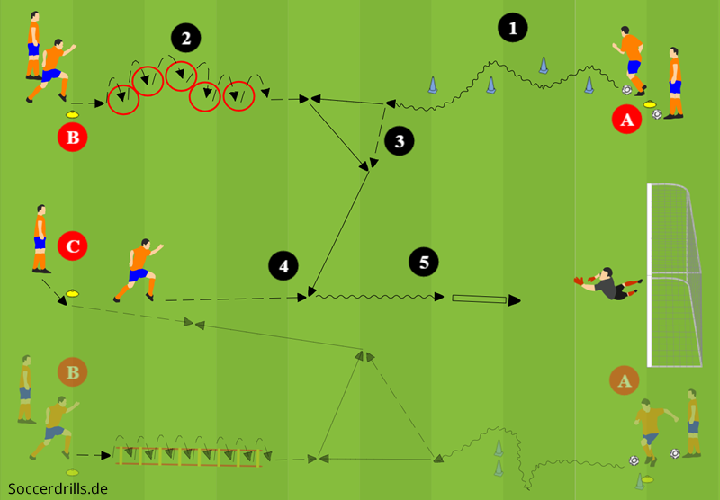 - Spieler A starte zur kleinen Hütchenwand, führt eine Finte aus und passt anschließend auf B.