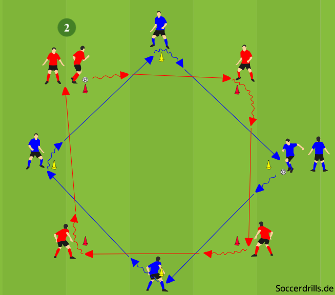 Die genaue Beschreibung entnehme bitte der Einstiegsübung. Beide Gruppen passen und laufen jetzt im Uhrzeigersinn. Achtung: Beim Start müssen auf der Startposition mindestens zwei Spieler postiert werden.