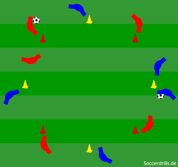 - Zwei Bälle pro Gruppe, dann wird es schwer. Der zweite Ball gehört dann bei Übungsstart auf die gegenüberliegende Seite (auch dort zwei Spieler!).