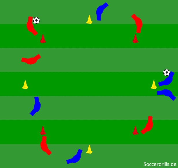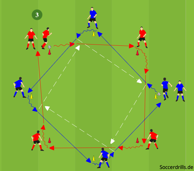 - Team Rot passt gegen den Uhrzeigersinn und Team Blau im Uhrzeigersinn. Auch hier können die Laufwege nach dem Pass getauscht werden.