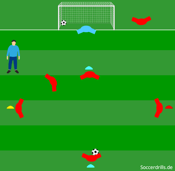 Material: 2 Bodenmarkierungen und 2x2 in unetrschiedlichen Farben, ausreichend Bälle und ein Tor.