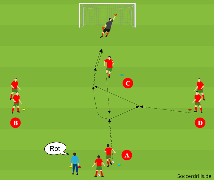 - Die Positionen A, B und D werden mehrfach mit Spielern besetzt, die Position C einfach. An Position A verfügen die Spieler über Bälle, ein Torwart kommt ins Tor.