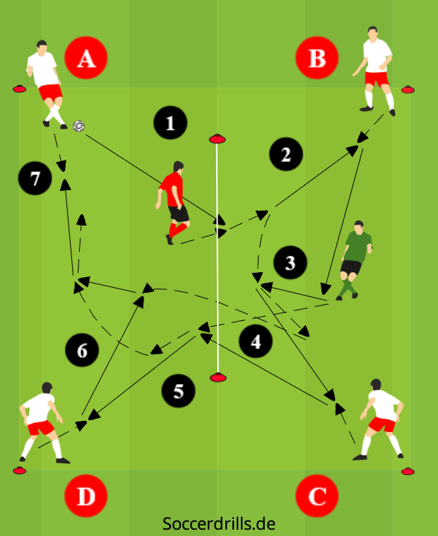- Er passt sofort weiter in Ecke D. Auch hier geht der Spieler seinem Pass nach und aus der Ecke kommt der Passempfänger dem Ball entgegen. Jetzt beginnt der Ablauf erneut, der den Ball in Ecke A weiterleitet.
