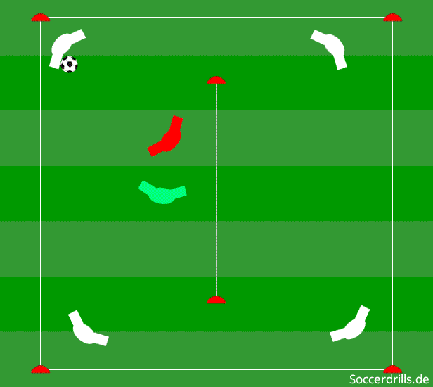 Ich weise hier nochmal darauf hin: Die Spieler sind alle in Bewegung, bieten sich in den Räumen an und konzentrieren sich auf ihre Aufgaben. Es folgt jetzt nur noch das freie Spiel, mit Pässen über die Schnittstellen-Linie, Pässen in die Ecken und dem Klatschen. Zusätzlich kann aus den Ecken in anderen Ecken gepasst werden, der Fantasie sind keine Grenzen gesetzt.