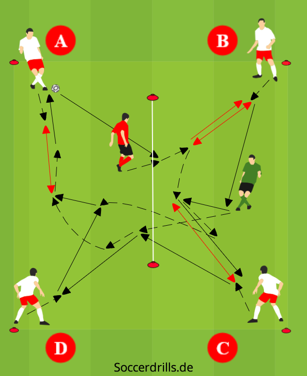 Der Spieler, der auf einen Spieler in der Ecke passt erhält den Ball zurück. Er lässt den Ball kurz klatschen und dann geht es mit dem Spieler in der Ecke weiter. Für die Lerninhalte dieser Übung macht dieses zusätzliche „klatschen lassen“ Sinn. Der Spieler der in die Ecke passt, muss jetzt seinem Pass nachgehen und anschließend wieder wegziehen, damit die Aktion möglichst schnell abläuft und fortgesetzt werden kann.