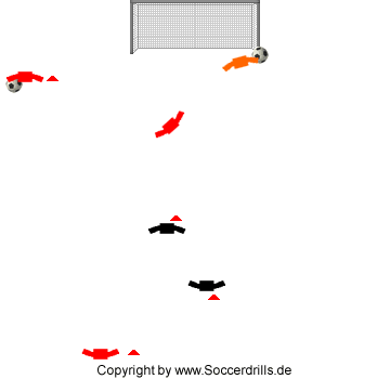 Material: Ausreichend Bälle, 4 Bodenmarkierungen zur Orientierung, 1 Tor.