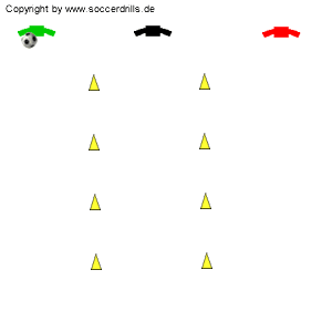 Der Ball wird zwischen den Hütchen durch die Reihe gepasst. Die Geschwindigkeit von Durchgang zu Durchgang erhöhen.