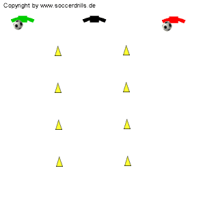 Je einen Ball auf den seitlichen Positionen! Der Spieler auf der Mittelbahn bekommt zwischen den Hütchen jeweils einen Pass von rechts und dann von links. Er spielt die Bälle sofort zurück. Achtung: Nach jedem Durchlauf tauschen die Spieler die Bahnen. Die Geschwindigkeit von Durchgang zu Durchgang erhöhen.