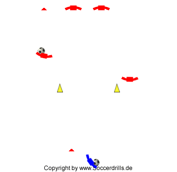 Zwei Spieler laufen in Richtung Hütchentor. Dort angekommen bieten sie sich links und rechts im Übungsfeld zum Passempfang an. Die Position muss so gewählt sein, dass jeder Spieler einen eventuellen Pass durchs Hütchentor schlagen kann.