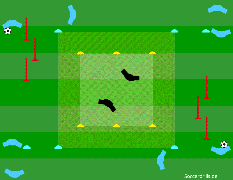 - Im inneren Quadrat werden zwei Torhüter postiert, natürlich sind dort auch Feldspieler möglich.