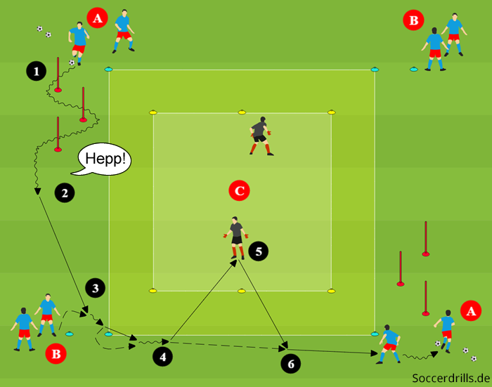 - B passt direkt weiter zu A. A verarbeitet den Ball und startet mit dem Slalomdribbling.