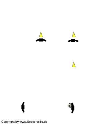 4 Spieler stellen sich im Rechteck auf, wie in der Animation zu sehen. Zwei Spieler passen sich einen Ball zu. Den Zeitpunkt des Übungsstart wählen die Spieler, indem sich der Passempfänger zu den beiden Übenden auf der anderen Seite des Rechtecks dreht. Einer der beiden oberen Spieler startet in den freien Raum und sprintet in Richtung Passgeber. Der zweite, obere Spieler startet ebenfalls, jedoch seitlich aus dem Schatten seines Mitspielers. Der Pass erfolgt auf den Spieler, der sich näher zum Ball befindet. Dieser passt den Ball auf die Startposition zurück. Der Passempfänger spielt den Ball auf den Spieler, der in Richtung der Markierung oben links in Position gelaufen ist. Der erste Passgeber in dieser Übung läuft um das Übungsfeld, um den nächsten Pass zu erhalten und, nach einer Rückwärtsbewegung mit Ball um die Markierung, in die Ausgangsposition zurückzuspielen. Dort hat sich der Spieler, der an der vorderen Markierung stand freigelaufen. Die Übung beginnt von vorne.