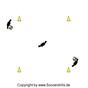 Ein Tipp: Nehme einen 4 Spieler hinzu und versuche es mit zwei Anspielern im Zentrum. Die Pässe werden fast nur noch in die Laufbewegung geschlagen, deshalb ist die Übung schwer. Gutes Timing, genaue Pässe und ein gutes Auge sind Grundvoraussetzung für das Gelingen dieses Passtrainings.