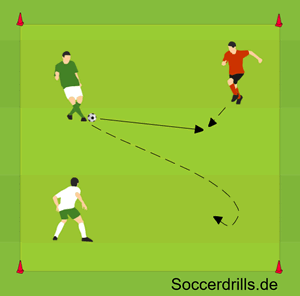 Der Ablauf der Animation: Die Spieler passen sich den Ball im "gedachten Rechteck" zu. Dies bedeutet, dass die Spieler sich ein Rechteck vorstellen, obwohl es gar nicht vorhanden ist. Bei 3 Übenden ist immer eine Ecke des Rechtecks nicht besetzt, so einfach ist das. Der Passgeber läuft nach dem Pass in die freie Ecke des "gedachten Rechtecks". Die Anspielperson ist frei wählbar.