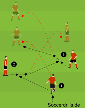 Die Animation: Die Spieler passen sich den Ball im "gedachten Rechteck" zu. Der Passgeber läuft - nach dem Pass - durch die Lücke zwischen den beiden anderen Spielern und bietet sich sofort wieder an. Die Anspielperson ist frei wählbar.