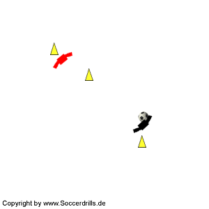 Zwei Spieler stehen sich gegenüber. Der Ballbesitzer startet zum Spieler ohne Ball und passt diesen genau an. Der Passempfänger läuft dem Ballbesitzer leicht entgegen. Das mittlere Hütchen simuliert einen passiven Verteidiger. Der Passempänger lässt den Ball kurz zwischen den Hütchen abtropfen und startet zwischen die unteren Hütchen leicht auf die andere Seite. Der Ballbesitzer dreht sich und passt den Ball genau in den Lauf des gestarteten Spielers. Der Passempfänger dribbelt anschließend auf die Startposition. Die Übung beginnt erneut mit vertauschten Rollen.