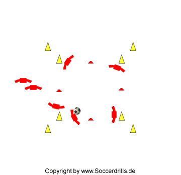 Die Spieler passen immer auf die nächste Position und folgen ihrem Pass. Die Passempfänger umrunden immer das äußere Hütchen und dribbeln dann bis zur Markierung, erst dann darf der Ball weitergeleitet werden.