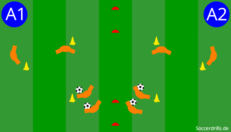 - Es werden 6 Hütchen, 4 Bodenmarkierungen und ausreichend Bälle benötigt.