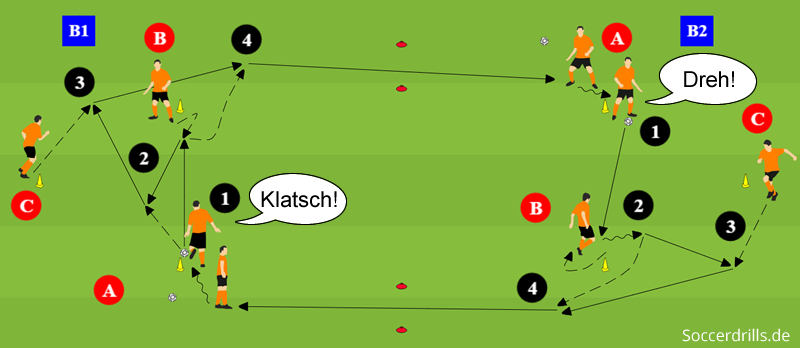 - Nach der Aktion übernimmt A die Position C, C die Position B. Die B-Spieler folgen ihrem Pass und schließen sich jeweils der A-Gruppe im anderen Dreieck an.