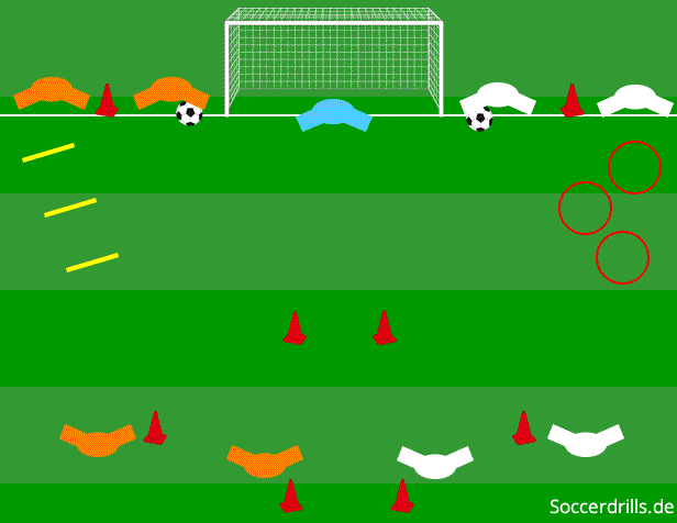 Alles halb so wild, wer laufen, vielleicht springen, im richtigen Moment passen und aufs Tor schießen kann, wird auch diese Übung bewältigen. Zum Start in den Ablauf erfolgt eine Koordinationsübung nach Trainerwahl. Wir haben uns in der Grafik für Minihürden und in der Animation für Stangen und Reifen entschieden. So geht es vorwärts oder rückwärts, springend und/oder mit Drehungen in eine sehr komplexe Trainingsübung. Im PDF findest du die komplette Beschreibung und mit der Animation wird der Ablauf sofort verstanden.