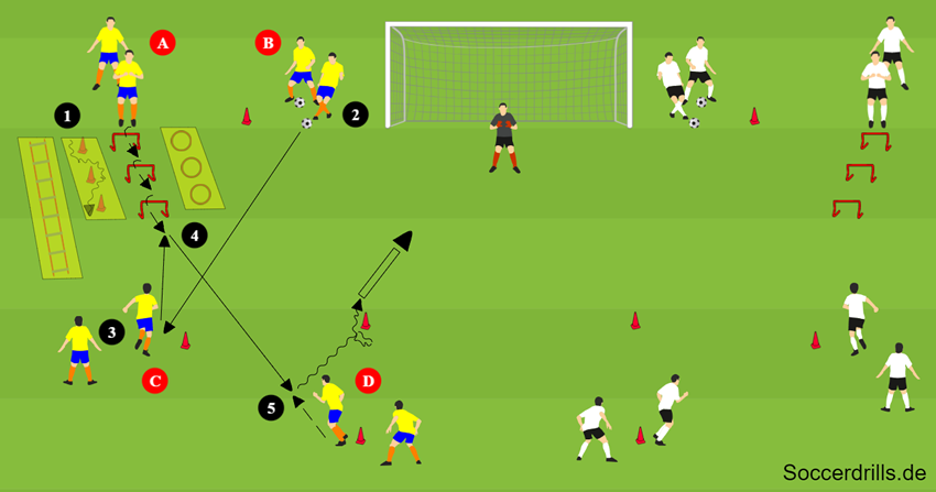 - Die Positionen an den Rückraumhütchen werden aufgelöst. Die Spieler an den äußeren Hütchen der Hütchenreihe, spielen einen Doppelpass und zwar mit den Spielern, die aus den Koordinationsaufgaben kommen. Sie ziehen dann selbst zum Tor und führen vor dem Torabschluss einen Trick aus.