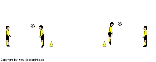 Die beiden Anspieler halten die Bälle wieder in den Händen. Sie werfen den laufenden Spielern den Ball so zu, dass der rotierende Spieler per Kopfball genau in die Arme des Anspielers zurückspielen kann. Der Kopfball kann erst aus dem Stand und später aus der Bewegung ausgeführt werden. Sowohl ein Kopfball aus dem Sprung, als auch auch aus dem Stand sind möglich.