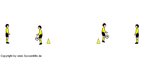 Feldgröße: Abstand zwischen den Hütchen 4 bis 5 Meter. Abstand der Anspieler zum Hütchen ca. 3 Meter.